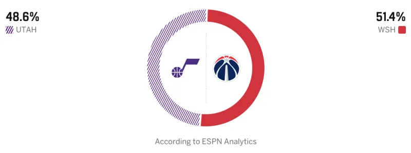 赛前,美媒ESPN预测本场比赛,爵士胜率48.6%,奇才胜率51.4%。